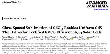 近日,信阳师范大学伟德BETVLCTOR,伟德BV官网王刚博士团队在硫化锑太阳能电池研究领域取得重要进展,相关成果以“Close-Spaced Sublimation of CdCl2 Enables Uniform CdS Thin Films for Certified 8.08%-Efficient Sb2S3 Solar Cells”为题发表在《Advanced Materials》杂志上。信阳师范大学为该论文的第一完成单位,王刚博士为第一通讯作者,黄玉茜博士为第一作者和共同通讯作者,硕士研究生冯琳为文章第二作者。